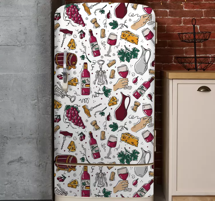 Entdecken Sie die faszinierende Welt unserer Folie Kühlschrank im food- und weinthema, die mit einem handgemalten Design von Weintrauben, Weingläsern und kulinarischen Köstlichkeiten verzaubert. Dieses grafische Meisterwerk bringt den Charme einer gemütlichen Küche direkt in Ihr Zuhause und lässt Feinschmecker-Herzen höher schlagen. Die erfrischenden Muster von Käse und Weinflaschen schaffen eine einladende Atmosphäre, die sowohl stilvoll als auch funktional ist. Ideal für jeden Kühlschrank, wird dieses Design zum Blickfang in Ihrer Küche!