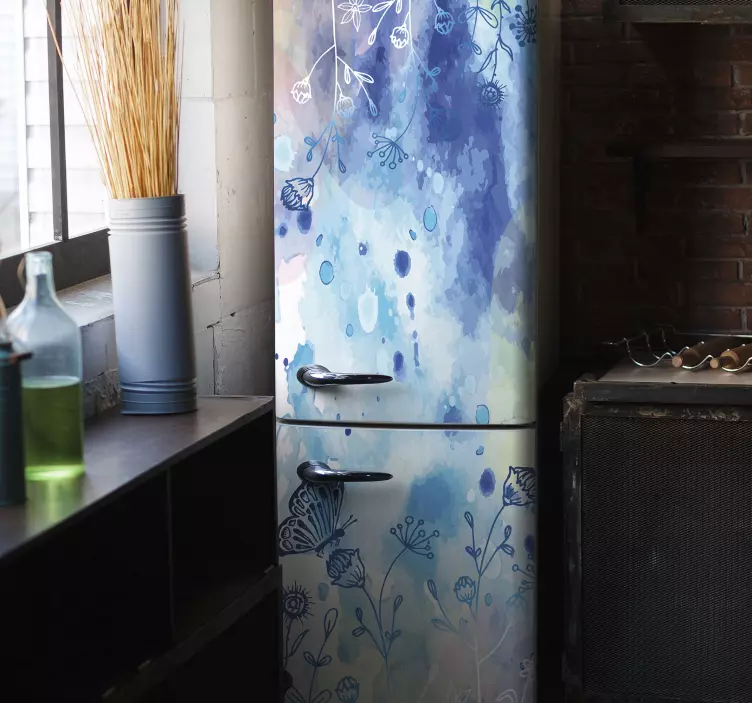 Verleihen Sie Ihrem Kühlschrank mit unserer Folie Kühlschrank mit floralem schmetterlingsmotiv einen frischen, lebendigen Look! Dieses atemberaubende Design kombiniert sanfte blaue Aquarelltöne mit zauberhaften Schmetterlingen und blühenden Blumen. Die grafische Darstellung bringt die Schönheit der Natur direkt in Ihre Küche und verwandelt alltägliche Gegenstände in wahre Kunstwerke. Die Spritzen und Zeichnungen verleihen dem Aufkleber eine dynamische Note und sorgen für ein buntes, harmonisches Gesamtbild.