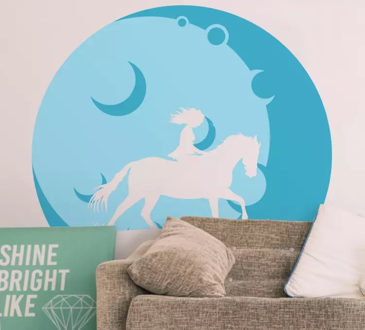 Entdecken Sie die bezaubernde Welt unserer Katzen Sticker Mädchen auf Pferd, die mit einem einzigartigen Design überzeugen! Dieses grafische Meisterwerk zeigt ein wunderschönes Pferd, das von einem fröhlichen Mädchen begleitet wird, während der Mond und die Silhouette der Natur die Szenerie verzaubern. Das sanfte Blau des Hintergrunds lädt zum Träumen ein und bringt eine friedliche Atmosphäre in jeden Raum.