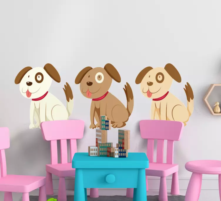 Referenz: A48962Ein charmantes Trio von verspielten Welpen im Cartoon-Stil, jeder mit einzigartigen Merkmalen und Ausdrücken. Dieses Design bringt eine fröhliche Atmosphäre, perfekt für Kinderzimmer, ansprechend für Tierliebhaber und schafft eine lebhafte Stimmung.