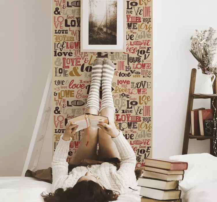 Referenz: A44817Eine lebendige Komposition, die verschiedene Ausdrücke von Liebe in unterschiedlichen Schriftarten und Stilen zeigt. Die warme Farbpalette kombiniert Rottöne und Erdtöne und schafft eine gemütliche und einladende Atmosphäre, die perfekt ist, um emotionale Räume zu bereichern.