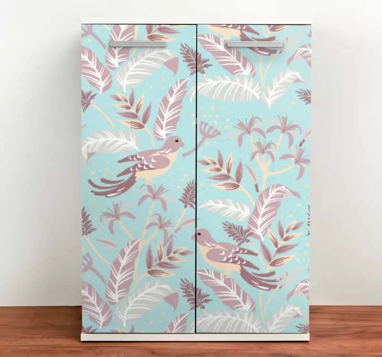 Die Möbelfolie botanisches vogel-emblem bringt die Farben der Natur direkt in Ihr Zuhause! Mit einem faszinierenden Design, das Vögel, Papageien, Blätter und tropische Blumen in sanften Pastellfarben kombiniert, verwandelt diese Folie Ihre Möbel in ein exotisches Kunstwerk. Die harmonische Verbindung von Flora und Fauna sorgt für eine dekorative Atmosphäre, die Freude und Lebendigkeit in jeden Raum bringt.