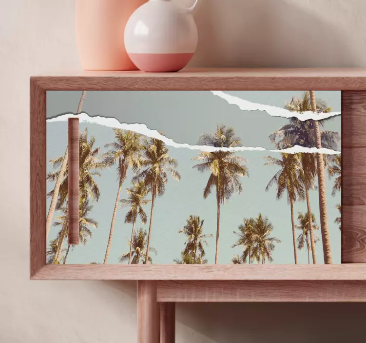 Die Möbelfolie tropischer palmenblick entführt Sie in eine friedliche, tropische Oase, in der Palmen sanft im Wind wiegen und die Natur mit ihrer Schönheit erstrahlt. Das Design zeigt zerrissenes Papier, das die künstlerische Anmutung von natürlichen Materialien einfängt und Ihre Möbel in ein paradiesisches Zuhause verwandelt. Schaffen Sie eine entspannende Atmosphäre, die zum Träumen einlädt und Ihre Wohnräume auf eine neue Ebene hebt!