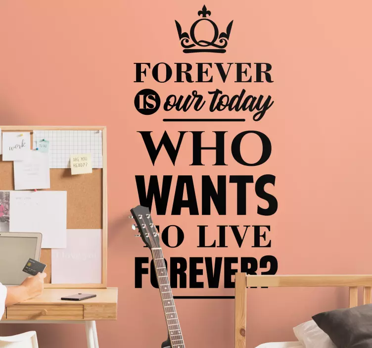 Entdecken Sie den einzigartigen Wandspruch wer will für immer leben, der nicht nur eine inspirierende Botschaft vermittelt, sondern auch durch sein grafisches Design besticht. Mit einer harmonischen Kombination aus Typografie und einem einfarbigen Look wird dieser Spruch für Wand zum echten Hingucker in jedem Raum. Der Text ist eine kreative Hommage an die Musik und die ewige Liebe und regt zum Nachdenken an.