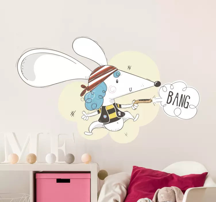 Referenz: A47215Eine verspielte Cartoon-Darstellung einer Maus, die als Pirat verkleidet ist, komplett mit einem gestreiften Hut und blauen Haaren. Der fantasievolle Charakter hält ein Spielzeug und ruft 'BANG', was ein Gefühl von Spaß und Abenteuer vermittelt, perfekt für Kinderzimmer.