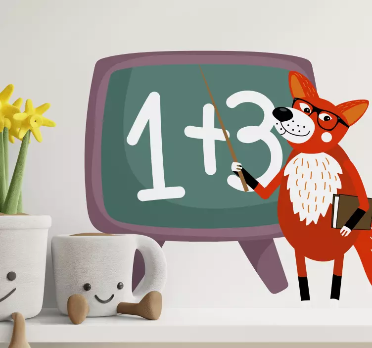 Referenz: A50989Ein charmantes Fuchs-Charakter steht neben einem Tafel und lehrt spielerisch eine einfache Mathematik-Gleichung. Dieses ansprechende Design verfügt über lebendige Farben, die darauf abzielen, eine unterhaltsame Lernumgebung zu schaffen, perfekt für Kinderzimmer. Der Fuchs, ausgestattet mit einem Zeigestock und einem Buch, lädt zur Neugier und Begeisterung bei jungen Lernenden ein.