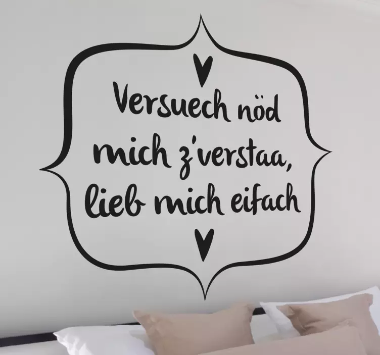 Referenz: A8953Bringen Sie mit diesem ausgefallenen Wandtattoo mit der Aufschrift "Versuech nöd mich z'verstaa, lieb mich eifach." ein Stück Ihrer Sprache kombiniert mit einem schönen Spruch an die Wände. Sorgen Sie für eine liebevolle und schweizerische Atmosphäre. Bringen Sie das Wandtattoo im Wohnzimmer, Esszimmer oder im Schlafzimmer an.