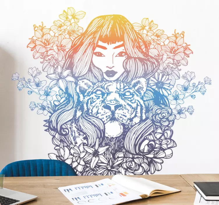 Verleihen Sie Ihrem Raum einen einzigartigen Charakter mit unserem atemberaubenden Wandtattoo Menschen Frau mit Tiger. Dieses fesselnde Design kombiniert keltische Elemente mit einer eleganten Darstellung einer Frau und einem majestätischen Tiger, umgeben von floralen Motiven. Die kunstvollen Strichzeichnungen und kräftigen Farben sorgen für einen lebendigen Eindruck, der jeden Betrachter in seinen Bann zieht und jeden Raum zum Leben erweckt.