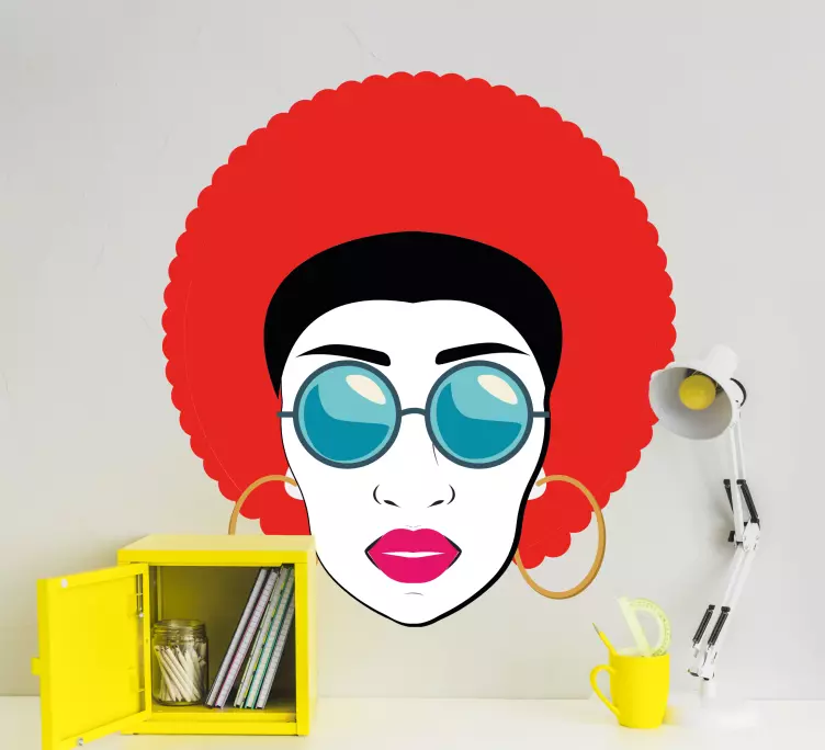Entdecken Sie das faszinierende Wandtattoo menschen mutiges afro-porträt, das mit seiner einzigartigen Darstellung einer Frau mit afro-frisur und Sonnenbrille begeistert. Diese farbenfrohe Illustration verkörpert feminines Flair und ist das perfekte Zubehör für jedes moderne Zuhause. Das Design kombiniert lebendige Farben und eine inspirierende Ausstrahlung, die jeden Raum aufwertet.