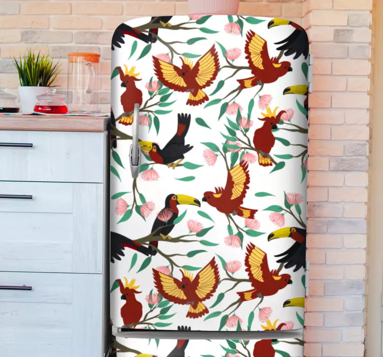 Bringen Sie ein Stück tropischer Natur in Ihr Zuhause mit unserem einzigartigen Wandtattoo Vögel mit tropischen Vogelmotiven. Dieses bezaubernde Design zeigt eine lebendige Kombination aus Kühlschrank, Papageien, und Tukane, die von bunten Mustern und blühenden Blumen umgeben sind. Die künstlerische Gestaltung ist beschwingt und wunderbar, perfekt, um jedem Raum eine fröhliche und einladende Atmosphäre zu verleihen.