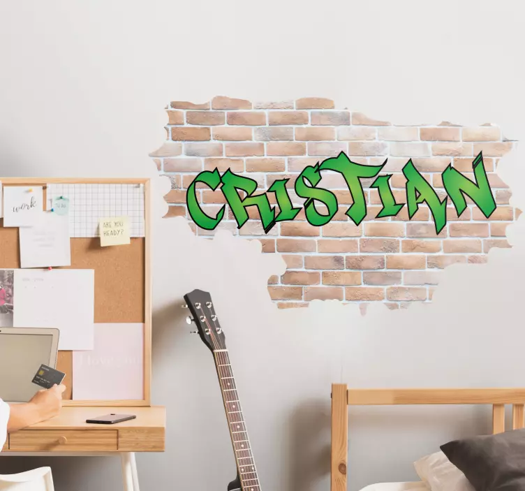 Referenz: A49602Ein lebendiges, urbanes Element mit einem benutzerdefinierten Namen im Graffiti-Stil, vor einem Hintergrund aus Ziegelmauer. Dieses Produkt verleiht jedem Raum eine kantige Note und ermöglicht eine persönliche Anpassung, um eine einzigartige Aussage zu schaffen.