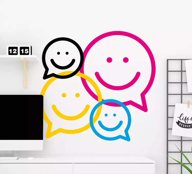 Referenz: A49042Eine verspielte Anordnung von Smileys in unterschiedlichen Größen und Farben repräsentiert Freude und Kommunikation. Diese fröhlichen Icons, stilisiert mit Sprechblasen, wecken Emotionen und schaffen eine lebhafte Atmosphäre, perfekt für Räume, die darauf abzielen, Positivität zu inspirieren.