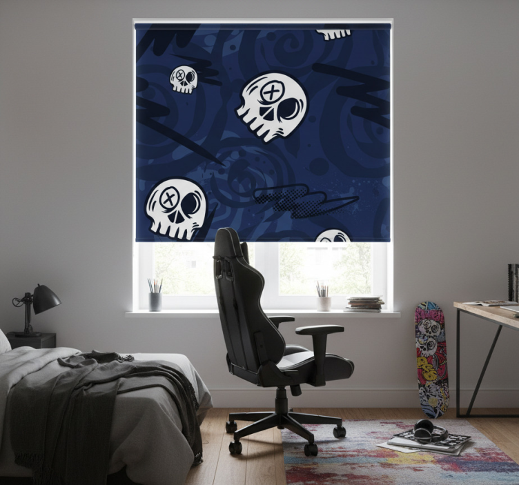 Referenz: E7586Entdecken Sie das aufregende Design unseres Rollo Fenster Jugendzimmer mit Graffiti Schädeln, das mit mutigen Farben und dynamischen Muster begeistert. Die stilvollen Schädel-Motive verleihen jedem Jugendzimmer eine einzigartige Atmosphäre und machen es zu einem echten Blickfang. Das Rollo harmoniert perfekt mit modernen und kreativen Einrichtungskonzepten und sorgt für einen Hauch von Individualität und Stil.