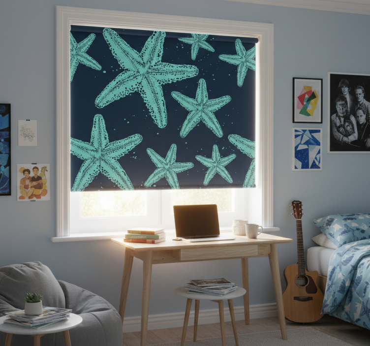 Referenz: E7549Beleben Sie das Jugendzimmer mit unserem Rollo Fenster Jugendzimmer Sternenfisch Blautöne. Dieses charmante Design begeistert durch eine harmonische Kombination aus sanften Blautönen, die an den Ozean erinnern, und niedlichen Sternenfischmotiven. Die lebendige Grafik sorgt nicht nur für eine fröhliche Atmosphäre, sondern bringt auch einen Hauch von Abenteuer in jeden Raum. Die einfache Montage mit nur zwei Klicks, die Möglichkeit zur einfache Demontage und die Pflegeleichtigkeit machen dieses Rollo zu einer idealen Wahl für jedes Jugendzimmer!