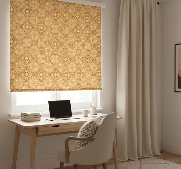 Referenz: E7545Entdecken Sie das Rollo Fenster Jugendzimmer vintage beiges ornamentmuster, das mit seinem eleganten und nostalgischen Design jeden Raum in eine Oase der Ruhe verwandelt. Dieses Rollo besticht durch ein ansprechendes ornamentales Muster und eine sanfte beige Farbgebung, die harmonisch mit verschiedenen Einrichtungsstilen harmoniert. Dank der einfachen Montage mit nur zwei Klicks lässt sich das Rollo spielend leicht anbringen und bietet gleichzeitig hervorragenden Schutz vor direkter Sonneneinstrahlung. Es sorgt für Privatsphäre, während es Ihnen die Freiheit gibt, den Lichteinfall nach Belieben zu regulieren!