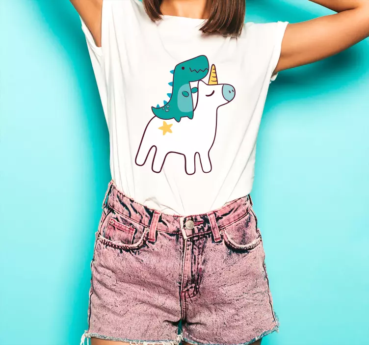 Referenz: T5138Dieses charmante Design zeigt eine fantasievolle Szene mit einem Einhorn, das mit einem Dinosaurier kombiniert ist, und schafft so eine spaßige und verspielte Atmosphäre. Helle Farben und niedliche Formen verstärken das verspielte Thema und machen es ideal für legere Kleidung.