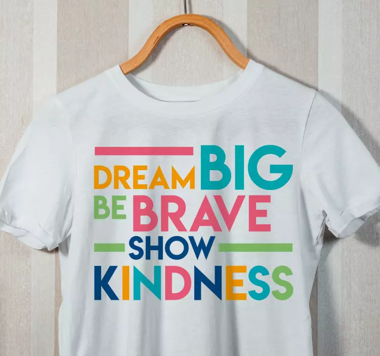 Referenz: T4142Dieses Design präsentiert inspirierende Worte in lebendigen Farben, die Positivität und Freundlichkeit fördern. Die Botschaft, gestaltet mit verspielter Typografie, spricht die Betrachter an und ist perfekt geeignet, um eine unterstützende Atmosphäre zu schaffen. Ideal für diejenigen, die daran glauben, Hoffnung und Ermutigung durch ihren Stil zu verbreiten.