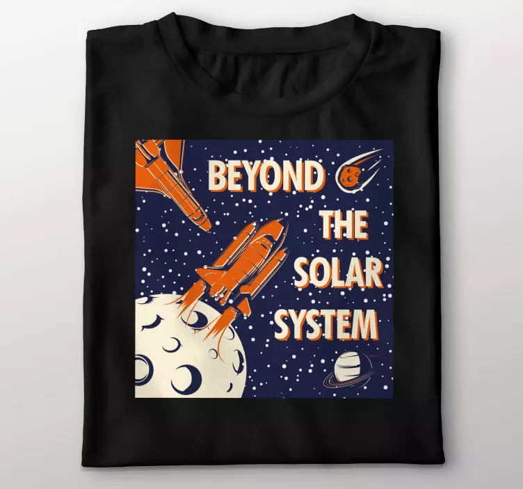 Referenz: T4800Dieses Design zeigt ein fesselndes Abenteuer im Weltraum, das eine Rakete zeigt, die an Planeten und einem Mond vorbeifliegt. Die lebendigen Farben und die auffällige Typografie laden zur Erkundung und Neugier über das Universum ein, was es zu einer ansprechenden Wahl für jeden macht, der von Raumfahrt fasziniert ist.