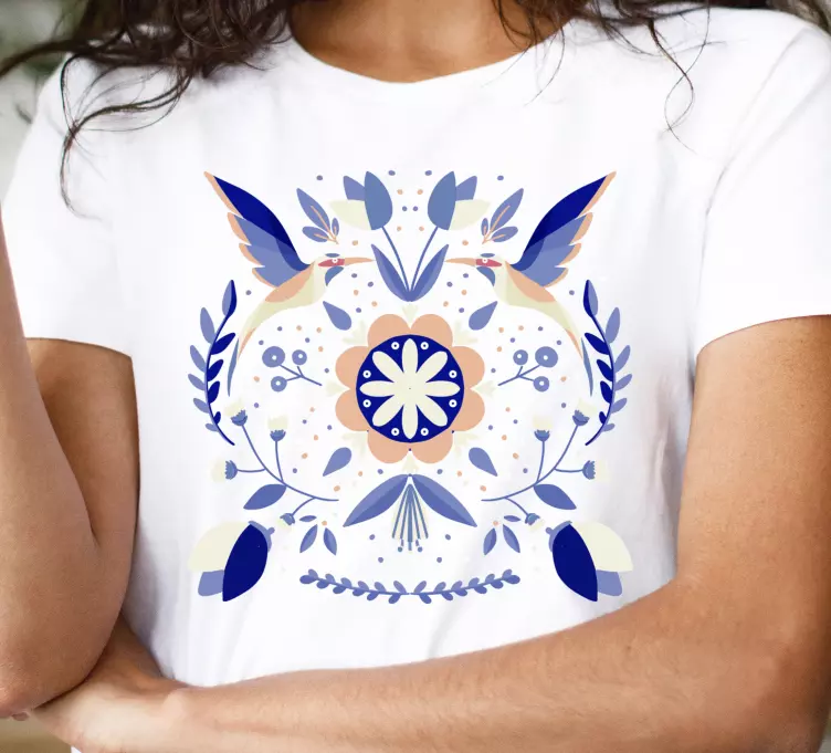Entdecken Sie unser Original T Shirt mit floralem Vogelmotiv, das durch ein einzigartiges Design besticht! Die grafischen Elemente verbinden blühende Blumen mit vogelartigen Motiven, die von folkloristischen und traditionellen Einflüssen inspiriert sind. Diese wunderlichen und stilvollen Designs bringen die Schönheit der Natur direkt auf Ihr Shirt, und das in einer dekorativen und bunten Präsentation.
