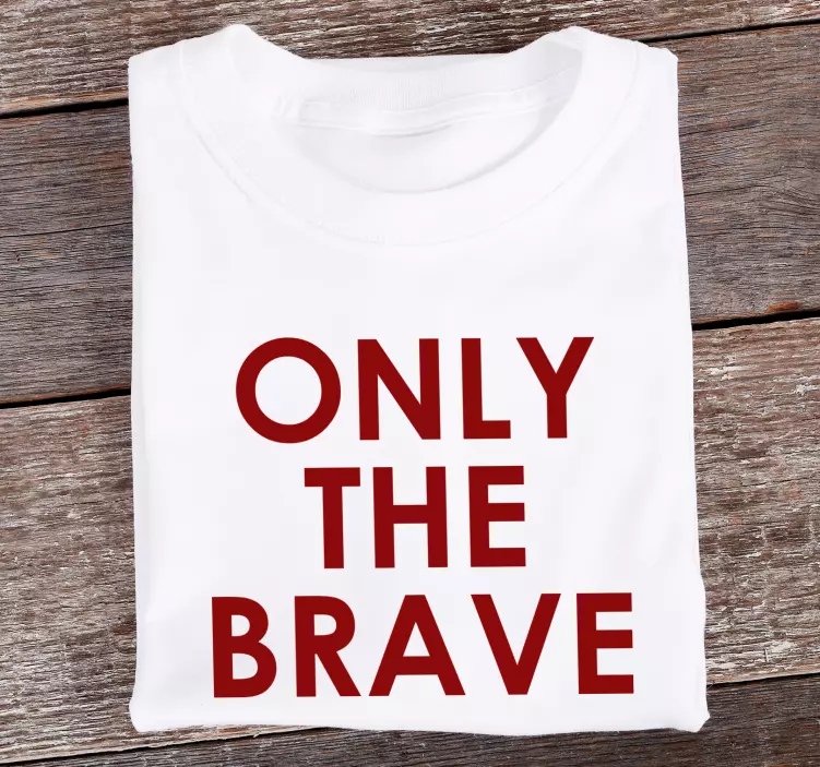 Referenz: T4822Dieses Design präsentiert eine gewagte Textaussage, die Tapferkeit betont. Die starke Typografie zieht die Aufmerksamkeit auf sich und vermittelt eine Botschaft von Mut. Ideal, um Stärke auszudrücken, spricht dieses Stück Personen an, die wirkungsvolle Phrasen in ihrer Garderobe schätzen.