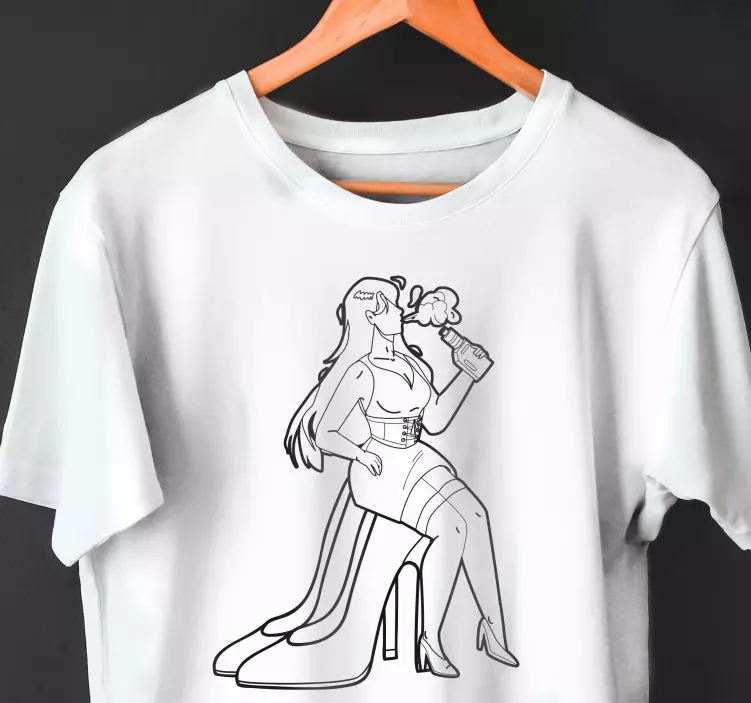 Entdecken Sie unser Original T Shirt mit stylischem high heel flair, das durch ein einzigartiges Design besticht. Die handgemalte Frauensilhouette in Kombination mit eleganten Fersen und einer künstlerischen Illustration vermittelt ein Gefühl von Zuversicht und Mode. Die Skizze zeigt eine Dame, die entspannt raucht oder dampft, während sie einen Cocktail genießt – perfekt für stilbewusste Frauen, die das Besondere lieben!