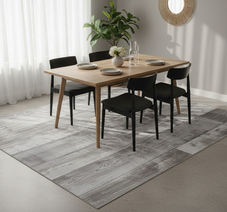 Der Vinyl Teppich Esszimmer in grauen Holzplanken ist nicht nur optisch ansprechend, sondern auch äußerst vielseitig. Er fügt sich nahtlos in verschiedene Einrichtungsstile ein und verleiht Ihrem Esszimmer eine moderne Note. Dank der realistischen Holzoptik wirkt der Teppich warm und einladend. Er ist eine kostengünstige Möglichkeit, um jeden Raum aufzuwerten und gleichzeitig den Boden zu schützen!