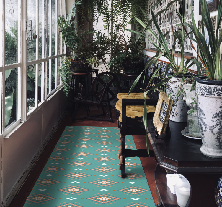 Das grafische Design dieses Vinyl Teppichs geometrisch läufer mit geometrischem muster ist von Diamanten und Rhomboiden inspiriert und verleiht Ihrem Raum ein orientalisches und symmetrisches Aussehen. Das blaugrüne Muster ist ein Blickfang und verleiht Ihrem Zuhause eine einzigartige Atmosphäre.