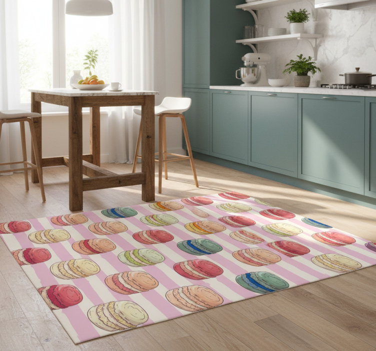 Referenz: R21225Willkommen in der Welt des einzigartigen Vinyl Teppich Küche im Retro Macarons Design, wo fröhliche Farben und verspielte Muster eine einladende Atmosphäre schaffen! Dieser Teppich ist nicht nur ein echter Hingucker mit seinen lebendigen Macaron-Motiven, sondern bietet auch zahlreiche Vorteile. Mit seiner rutschfesten Oberfläche sorgt er für Sicherheit in der Küche, während die kratzfesten und feuerfesten Materialien dafür sorgen, dass er den Alltag problemlos meistert. Zudem schützt er Ihren Boden und ist eine kostengünstige Lösung für eine stilvolle Wohnraumgestaltung!