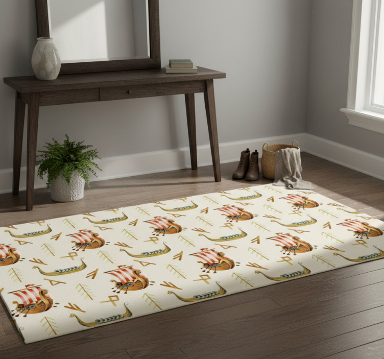 Der Vinyl Teppich Natur mit Wikingerschiff Muster ist die perfekte Wahl für alle, die ihren Wohnraum stilvoll und zugleich funktional gestalten möchten. Dank seines einzigartigen Designs wird jeder Raum sofort aufgewertet und erhält eine persönliche Note. Er eignet sich ideal für Wohnzimmer, Kinderzimmer oder auch im Flur. Lassen Sie Ihrer Kreativität freien Lauf und setzen Sie mit diesem Teppich wunderbare Akzente in Ihrer Dekoration!